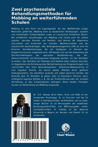 Mobbing ist eine Form von Jugendgewalt, die das Wohlbefinden junger Menschen gefährdet. Mobbing kann zu körperlichen Verletzungen, sozialen und emotionalen Schwierigkeiten sowie zu schulischen Problemen führen. Die schädlichen Auswirkungen von Mobbing sind häufig auch für andere spürbar, darunter Freunde und Familien, und können die allgemeine Gesundheit und Sicherheit von Schulen, Nachbarschaften und der Gesellschaft beeinträchtigen. Das Kontingenzmanagement (CM) ist eine Art klinische Verhaltenstherapie, die am häufigsten im Bereich des Drogenmissbrauchs eingesetzt wird. CM bezieht sich auf die Anwendung der Drei-Term-Kontingenz der operanten Konditionierung, bei der Stimuluskontrolle und Konsequenzen eingesetzt werden, um das Verhalten zu ändern. Das Verhalten der Patienten wird belohnt (oder seltener bestraft), im Allgemeinen die Einhaltung oder Nichteinhaltung von Programmregeln und -vorschriften oder ihres Behandlungsplans. Selbstinstruktionstraining ist eine kognitive Technik, die darauf abzielt, Klienten durch geführte Selbstgespräche, die allmählich verdeckt und selbst generiert werden, die Kontrolle über ihr Verhalten zu geben. Dies ist besonders hilfreich, wenn anfängliche kognitive Defizite, z. B. bei der Problemlösung oder der verbalen Vermittlung, zu den Schwierigkeiten beitragen. Diese beiden Therapien wurden zur Behandlung von Mobbing eingesetzt.