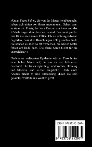 »Unter Theos Füßen, die von der Mauer herabbaumeln, haben sich einige von ihnen angesammelt. Sehen kann er sie nicht. Einzig das leise Kratzen am Stein und das Röcheln sagen ihm, dass sie da sind. Bestimmt greifen ihre Hände nach seinen Füßen. Ob sie wohl irgendwann begreifen, dass ihre Bemühungen völlig sinnlos sind? Sie können es noch so oft versuchen, die letzten Meter fehlen am Ende doch. Die obere Kante bleibt für sie unerreichbar.«Nach einer weltweiten Epidemie wächst Theo hinter einer hohen Mauer auf, die ihn vor den Infizierten beschützt. Die Katastrophe liegt weit zurück, Ordnung und Struktur sind wieder eingekehrt. Doch eines Abends macht er eine Entdeckung, durch die sein gesamtes Weltbild ins Wanken gerät.