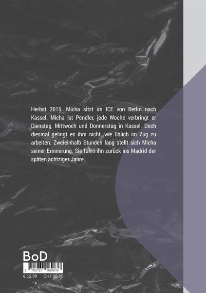 Herbst 2015. Micha sitzt im ICE von Berlin nach Kassel. Micha ist Pendler, jede Woche verbringt er Dienstag, Mittwoch und Donnerstag in Kassel. Doch diesmal gelingt es ihm nicht, wie üblich im Zug zu arbeiten. Zweieinhalb Stunden lang stellt sich Micha seiner Erinnerung. Sie führt ihn zurück ins Madrid der späten achtziger Jahre.
