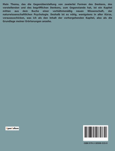 Mein Thema, das die Gegenüberstellung von zweierlei Formen des Denkens, des vorstellenden und des begrifflichen Denkens, zum Gegenstande hat, ist ein Kapitel mitten aus dem Buche einer verhältnismäßig neuen Wissenschaft, der naturwissenschaftlichen Psychologie. Deshalb ist es nötig, wenigstens in aller Kürze, vorauszuschicken, was ich als den Inhalt der vorhergehenden Kapitel, also als die Grundlage meiner Erörterungen ansehe.