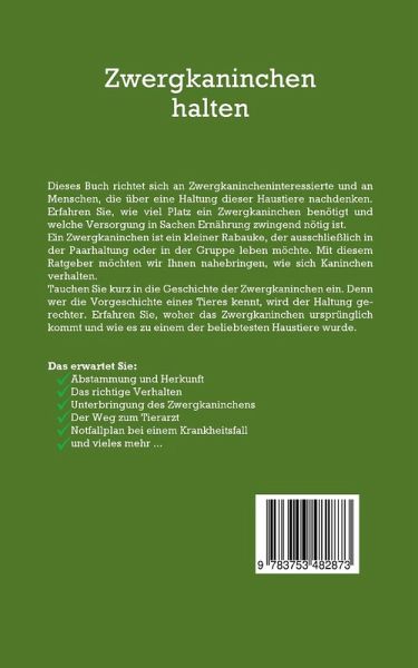 Dieses Buch richtet sich an Zwergkanincheninteressierte und an Menschen, die über eine Haltung dieser Haustiere nachdenken. Erfahren Sie, wie viel Platz ein Zwergkaninchen benötigt und welche Versorgung in Sachen Ernährung zwingend nötig ist. Ein Zwergkaninchen ist ein kleiner Rabauke, der ausschließlich in der Paarhaltung oder in der Gruppe leben möchte. Mit diesem Ratgeber möchten wir Ihnen nahebringen, wie sich Kaninchen verhalten. Tauchen Sie kurz in die Geschichte der Zwergkaninchen ein. Denn wer die Vorgeschichte eines Tieres kennt, wird der Haltung gerechter. Erfahren Sie, woher das Zwergkaninchen ursprünglich kommt und wie es zu einem der beliebtesten Haustiere wurde. Das erwartet Sie:-Abstammung und Herkunft-Das richtige Verhalten-Unterbringung des Zwergkaninchens-Der Weg zum Tierarzt-Notfallplan bei einem Krankheitsfall-und vieles mehr ...