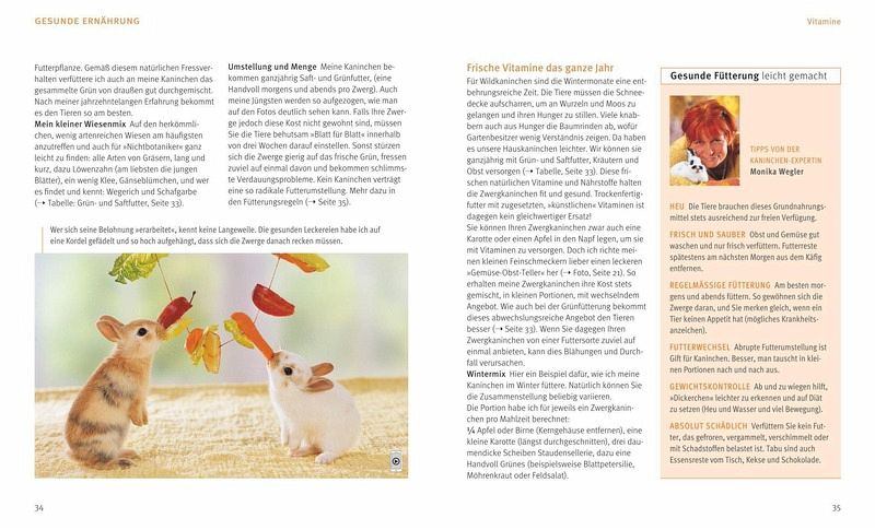 -das mögen die Zwerge. In der Großstadt können die meisten Kaninchen von einem Außengehege mit grünem Gras nur träumen. Auf dem Land sollten sie unbedingt für ein paar Stunden in einem ausreichend großem Gehege an der frischen Luft verbringen- super Rasenmäher! Auch Balkone tun´s- Hauptsache frische Luft. (Aber auf gar keinen Fall Zugluft!) Zum Schutz gegen Greifvögel und Katzen sollten die Gehege unbedingt oben abgedeckt werden. Weiterhin gibt es einen praktischen Futterplan, Tipps zu Gesundheit dem richtigen Umgang und weitere Anregungen für die Beschäftigung der Sinne. Ein toller Lesespaß für Nagerfans!