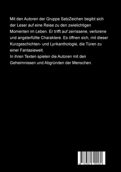 Mit den Autoren der Gruppe SatzZeichen begibt sich der Leser auf eine Reise zu den zwielichtigen Momenten im Leben. Er trifft auf zerrissene, verlorene und angsterfüllte Charaktere. Es öffnen sich, mit dieser Kurzgeschichten- und Lyrikanthologie, die Türen zu einer Fantasiewelt.In ihren Texten spielen die Autoren mit den Geheimnissen und Abgründen der Menschen.