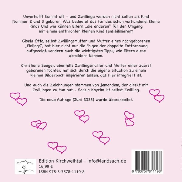 Wenn Zwillinge erwartet werden, stellt das nicht nur die Lebensplanung der Eltern auf den Kopf. Auch auf ein bereits vorhandenes Geschwisterkind kommen große Veränderungen zu. Wie diese bereits im Vorfeld abgemildert und zum Positiven verändert werden können, darüber gibt dieses kleine Büchlein Auskunft. Und damit Sie das gleich direkt am Geschwisterchen ausprobieren können, beinhaltet der kleine Ratgeber auch ein Kinderbuch mit Möglichkeiten zum Ausmalen der Schwarz/Weiß-Zeichnungen. Elternerfahrungen runden das Buch ab. Und es gibt ein Extra-Malbuch unter dem Titel "Marie wird Zwillings-Schwester", falls das Thema noch vertieft werden soll. Natürlich kommt auch zur Sprache, wie es ist, wenn die Zwillinge selbst ein Geschwisterchen bekommen.