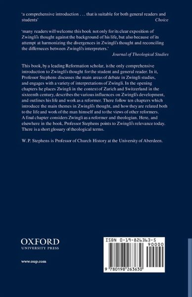 This book, by a leading Reformation scholar, is the only comprehensive introduction to Zwingli's thought for the student and general reader. In it Professor Stephens discusses the main areas of debate in Zwingli studies, and engages with a variety of interpretations of Zwingli. In the opening chapters he places Zwingli in the context of Zurich and Switzerland in the sixteenth century, describes the various influences on Zwingli's development, and outlines his life as a reformer. There follow two chapters which introduce the main themes in Zwingli's thought, and these are related both to the life and work of the man himself as well as to the views of other reformers. A final chapter considers Zwingli as a reformer and theologian. Here, and elsewhere in the book, Professor Stephens points to Zwingli's relevance today. There is a short glossary of theological terms.