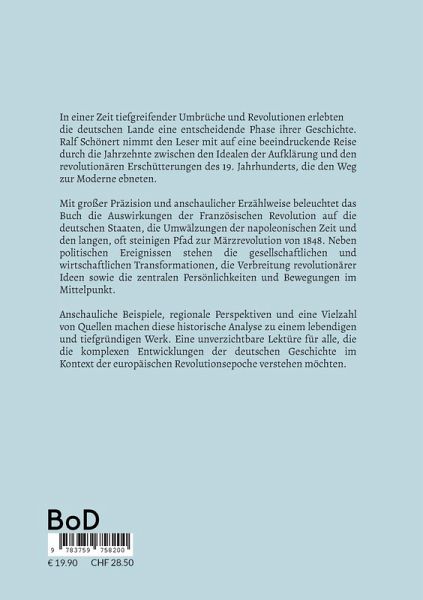 In einer Zeit tiefgreifender Umbrüche und Revolutionen erlebten die deutschen Lande eine entscheidende Phase ihrer Geschichte. Ralf Schönert nimmt den Leser mit auf eine beeindruckende Reise durch die Jahrzehnte zwischen den Idealen der Aufklärung und den revolutionären Erschütterungen des 19. Jahrhunderts, die den Weg zur Moderne ebneten. Mit großer Präzision und anschaulicher Erzählweise beleuchtet das Buch die Auswirkungen der Französischen Revolution auf die deutschen Staaten, die Umwälzungen der napoleonischen Zeit und den langen, oft steinigen Pfad zur Märzrevolution von 1848. Neben politischen Ereignissen stehen die gesellschaftlichen und wirtschaftlichen Transformationen, die Verbreitung revolutionärer Ideen sowie die zentralen Persönlichkeiten und Bewegungen im Mittelpunkt. Anschauliche Beispiele, regionale Perspektiven und eine Vielzahl von Quellen machen diese historische Analyse zu einem lebendigen und tiefgründigen Werk. Eine unverzichtbare Lektüre für alle, die die komplexen Entwicklungen der deutschen Geschichte im Kontext der europäischen Revolutionsepoche verstehen möchten.