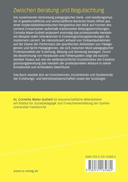 Die zunehmende Verbreitung pädagogischer Denk- und Handlungsmuster in gesellschaftliche und wirtschaftliche Bereiche hinein öffnet aus einer modernitätstheoretischen Perspektive den Blick auf Formen des Lernens Erwachsener außerhalb traditioneller Bildungseinrichtungen. Cornelia Maier-Gutheil analysiert erstmalig das professionelle Handeln am Beispiel realer Interaktionen in Existenzgründungsberatungen als modernem Lernort. Sie rekonstruiert anhand von Tonbandaufnahmen auf der Ebene der Performanz die spezifischen Aktivitäten von PädagogInnen und Nicht-PädagogInnen, die sich zwischen Modi pädagogischer Professionalität der Erziehung, Bildung und Beratung bewegen. Durch die Bestimmung von Paradoxien und Fehlerquellen zeigt die Autorin darüber hinaus auf, wie die widersprüchliche Grundstruktur der Existenzgründungsberatung das Handeln der professionellen Akteure in seiner Komplexität und Ambivalenz beeinflusst.