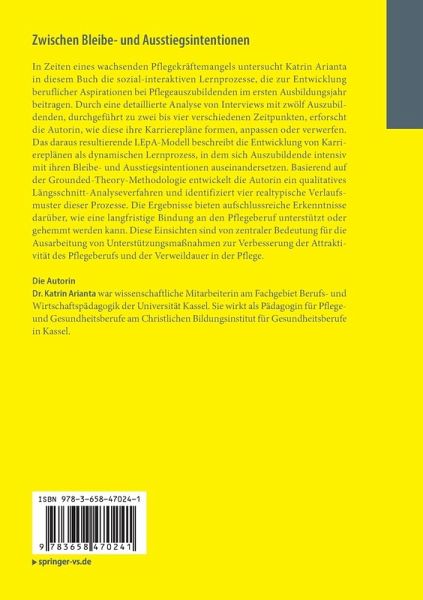 In Zeiten eines wachsenden Pflegekräftemangels untersucht Katrin Arianta in diesem Buch die sozial-interaktiven Lernprozesse, die zur Entwicklung beruflicher Aspirationen bei Pflegeauszubildenden im ersten Ausbildungsjahr beitragen. Durch eine detaillierte Analyse von Interviews mit zwölf Auszubildenden, durchgeführt zu zwei bis vier verschiedenen Zeitpunkten, erforscht die Autorin, wie diese ihre Karrierepläne formen, anpassen oder verwerfen. Das daraus resultierende LEpA-Modell beschreibt die Entwicklung von Karriereplänen als dynamischen Lernprozess, in dem sich Auszubildende intensiv mit ihren Bleibe- und Ausstiegsintentionen auseinandersetzen. Basierend auf der Grounded-Theory-Methodologie entwickelt die Autorin ein qualitatives Längsschnitt-Analyseverfahren und identifiziert vier realtypische Verlaufsmuster dieser Prozesse. Die Ergebnisse bieten aufschlussreiche Erkenntnisse darüber, wie eine langfristige Bindung an den Pflegeberuf unterstützt oder gehemmt werden kann. Diese Einsichten sind von zentraler Bedeutung für die Ausarbeitung von Unterstützungsmaßnahmen zur Verbesserung der Attraktivität des Pflegeberufs und der Verweildauer in der Pflege.