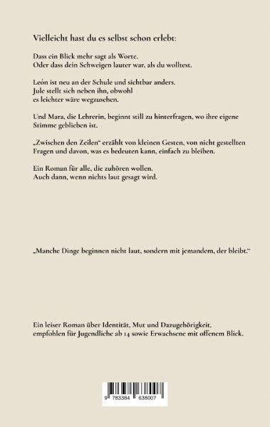 Leon fühlt sich fremd in der Welt und in seinem eigenen Körper.Zwischen Klassenzimmern, Fluren und Gedanken beginnt ein leiser Kampf um Sichtbarkeit, Identität und das Recht, einfach zu sein.In "Zwischen den Zeilen" begleiten wir León auf seiner Suche nach einem Platz im Leben, nach Menschen, die zuhören und nach Worten, die endlich das ausdrücken, was lange verschwiegen wurde.Ein feinfühliger Roman über Transidentität, das Gefühl von Nichtzugehörigkeit und die Kraft kleiner Begegnungen. Für alle, die zwischen den Zeilen lesen und spüren wollen, was es heißt, sich selbst zu finden.
