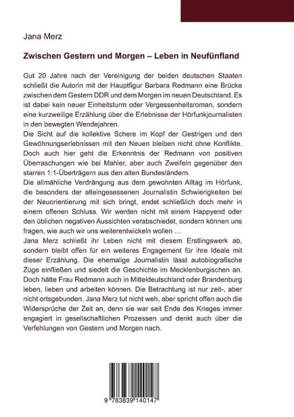 Jana MerzZwischen Gestern und Morgen - Leben in NeufünflandGut 20 Jahre nach der Vereinigung der beiden deutschen Staaten schließt die Autorin mit der Hauptfigur Barbara Redmann eine Brücke zwischen dem Gestern DDR und dem Morgen im neuen Deutschland. Es ist dabei kein neuer Einheitsturm oder Vergessenheitsroman, sondern eine kurzweilige Erzählung über die Erlebnisse der Hörfunkjournalisten in den bewegten Wendejahren. Die Sicht auf die kollektive Schere im Kopf der Gestrigen und den Gewöhnungserlebnissen mit den Neuen bleiben nicht ohne Konflikte. Doch auch hier geht die Erkenntnis der Redmann von positiven Überraschungen wie bei Mahler, aber auch Zweifeln gegenüber den starren 1:1-Überträgern aus den alten Bundesländern.Die allmähliche Verdrängung aus dem gewohnten Alltag im Hörfunk, die besonders der alteingesessenen Journalistin Schwierigkeiten bei der Neuorientierung mit sich bringt, endet schließlich doch mehr in einem offenen Schluss. Wir werden nicht mit einem Happyend oder den üblichen negativen Aussichten verabschiedet, sondern können uns fragen, wie auch wir uns weiterentwickeln wollen ...Jana Merz schließt ihr Leben nicht mit diesem Erstlingswerk ab, sondern bleibt offen für ein weiteres Engagement für ihre Ideale mit dieser Erzählung. Die ehemalige Journalistin lässt autobiografische Züge einfließen und siedelt die Geschichte im Mecklenburgischen an. Doch hätte Frau Redmann auch in Mitteldeutschland oder Brandenburg leben, lieben und arbeiten können. Die Betrachtung ist nur zeit-, aber nicht ortsgebunden. Jana Merz tut nicht weh, aber spricht offen auch die Widersprüche der Zeit an, denn sie war seit Ende des Krieges immer engagiert in gesellschaftlichen Prozessen und denkt auch über die Verfehlungen von Gestern und Morgen nach.