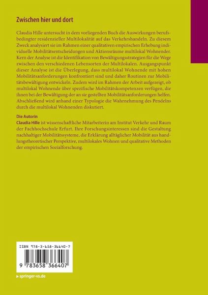 Claudia Hille untersucht in dem vorliegenden Buch die Auswirkungen berufsbedingter, residenzieller Multilokalität auf das Verkehrshandeln. Zu diesem Zweck analysiert sie im Rahmen einer qualitativen empirischen Erhebung individuelle Mobilitätsentscheidungen und Aktionsräume multilokal Wohnender. Kern der Analyse ist die Identifikation von Bewältigungsstrategien für die Wege zwischen den verschiedenen Lebensorten der Multilokalen. Ausgangspunkt dieser Analyse ist die Überlegung, dass multilokal Wohnende mit hohen Mobilitätsanforderungen konfrontiert sind und daher Routinen zur Mobilitätsbewältigung entwickeln. Zudem wird im Rahmen der Arbeit aufgezeigt, ob multilokal Wohnende über spezifische Mobilitätskompetenzen verfügen, die ihnen bei der Bewältigung der an sie gestellten Mobilitätsanforderungen helfen. Abschließend wird anhand einer Typologie die Wahrnehmung des Pendelns durch die multilokal Wohnenden diskutiert.