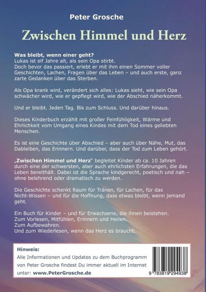 Was bleibt, wenn einer geht? Lukas ist elf Jahre alt, als sein Opa stirbt. Doch bevor das passiert, erlebt er mit ihm einen Sommer voller Geschichten, Lachen, Fragen über das Leben - und erste, ganz zarte Gedanken über das Sterben. Als Opa krank wird, verändert sich alles: Lukas sieht, wie sein Opa schwächer wird, wie er gepflegt wird, wie der Abschied näherkommt. Und er bleibt. Jeden Tag. Bis zum Schluss. Und darüber hinaus. Dieses Kinderbuch erzählt mit großer Feinfühligkeit, Wärme und Ehrlichkeit vom Umgang eines Kindes mit dem Tod eines geliebten Menschen. Es ist eine Geschichte über Abschied - aber auch über Nähe, Mut, das Dableiben, das Erinnern. Und darüber, dass der Tod zum Leben gehört. "Zwischen Himmel und Herz" begleitet Kinder ab ca. 10 - 12 Jahren durch eine der schwersten, aber auch ehrlichsten Erfahrungen, die das Leben bereithält. Dabei ist die Sprache kindgerecht, poetisch und nah - ohne belehrend oder dramatisch zu werden. Die Geschichte schenkt Raum für Tränen, für Lachen, für das Nicht-Wissen - und für die Hoffnung, dass etwas bleibt, wenn jemand geht. Die Handlung ist realitätsnah, mitfühlend und lebensbejahend: Ein Junge verliert seinen Opa - und entdeckt, dass man trotzdem weitergehen kann. Nicht, weil der Schmerz verschwindet, sondern weil Liebe nicht aufhört. Ein Buch für Kinder - und für Erwachsene, die ihnen beistehen. Zum Vorlesen, Mitfühlen, Erinnern und Heilen. Zum Aufbewahren. Und zum Wiederlesen, wenn das Herz es braucht. Für Kinder ab 10 Jahren, Eltern und Großeltern, die sich mit dem Thema Tod auseinandersetzen wollen - sanft, ehrlich und einfühlsam.