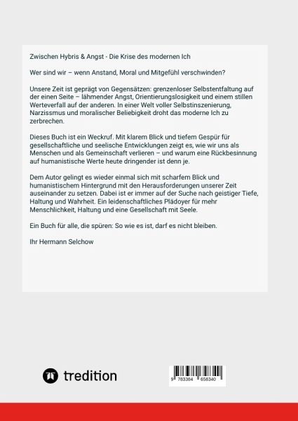 Zwischen Hybris & Angst: Die Krise des modernen IchEin aufrüttelndes Sachbuch über den Verlust unserer Werte in einer zerrissenen WeltWarum scheint unsere Gesellschaft trotz Fortschritt, Freiheit und Wohlstand orientierungsloser denn je? In "Zwischen Hybris & Angst: Die Krise des modernen Ich" wird schonungslos offengelegt, wie das moderne Ich zwischen Selbstüberhöhung und tiefer Verunsicherung zerrieben wird - und dabei zentrale humanistische Werte wie Anstand, Loyalität, Verantwortung und Moral verloren gehen.Dieses Buch ist ein leidenschaftliches Plädoyer für die Rückbesinnung auf das, was…mehr