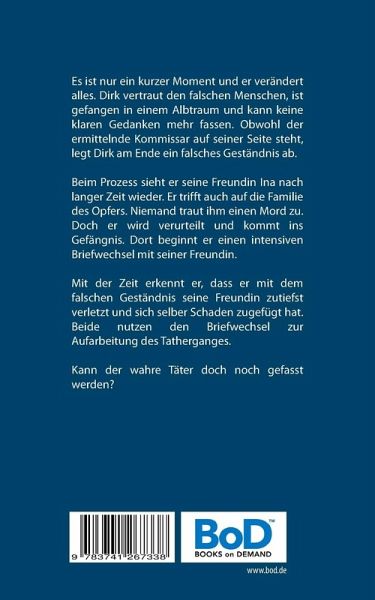 Es ist nur ein kurzer Moment und er verändert alles. Dirk vertraut den falschen Menschen, ist gefangen in einem Albtraum und kann keine klaren Gedanken mehr fassen. Obwohl der ermittelnde Kommissar auf seiner Seite steht, legt Dirk am Ende ein falsches Geständnis ab. Beim Prozess sieht er seine Freundin Ina nach langer Zeit wieder. Er trifft auch auf die Familie des Opfers. Niemand traut ihm einen Mord zu. Doch er wird verurteilt und kommt ins Gefängnis. Dort beginnt er einen intensiven Briefwechsel mit seiner Freundin. Mit der Zeit erkennt er, dass er mit dem falschen Geständnis seine Freundin zutiefst verletzt und sich selber Schaden zugefügt hat. Beide nutzen den Briefwechsel zur Aufarbeitung des Tatherganges. Kann der wahre Täter doch noch gefasst werden?