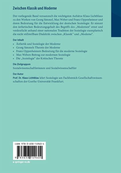 Der vorliegende Band versammelt die wichtigsten Aufsätze Klaus Lichtblaus zu den Werken von Georg Simmel, Max Weber und Franz Oppenheimer und deren Bedeutung für die Entwicklung der deutschen Soziologie. Er nimmt den ästhetischen Bedeutungsgehalt des Begriffs des "Modernen" ernst und verdeutlicht anhand einer nationalen Tradition der Soziologie exemplarisch die nicht stillstellbare Dialektik zwischen "Klassik" und "Moderne".