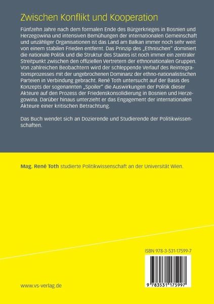 Fünfzehn Jahre nach dem formalen Ende des Bürgerkrieges in Bosnien und Herzegowina und intensiven Bemühungen der internationalen Gemeinschaft und unzähliger Organisationen ist das Land am Balkan immer noch sehr weit von einem stabilen Frieden entfernt. Das Prinzip des "Ethnischen" dominiert die nationale Politik und die Struktur des Staates ist noch immer ein zentraler Streitpunkt zwischen den offiziellen Vertretern der ethnonationalen Gruppen. Von zahlreichen Beobachtern wird der schleppende Verlauf des Reintegrationsprozesses mit der ungebrochenen Dominanz der ethno-nationalistischen Parteien in Verbindung gebracht. René Toth untersucht auf der Basis des Konzepts der sogenannten "Spoiler" die Auswirkungen der Politik dieser Akteure auf den Prozess der Friedenskonsolidierung in Bosnien und Herzegowina. Darüber hinaus unterzieht er das Engagement der internationalen Akteure einer kritischen Betrachtung. Das Buch wendet sich an Dozierende und Studierende der Politikwissenschaften.