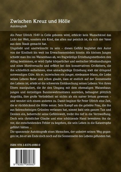 Zwischen Kreuz und HölleAutobiografieAls Peter Ullrich 1949 in Celle geboren wird, erblickt kein Wunschkind das Licht der Welt, sondern ein Kind, das allen nur peinlich ist, da sich der Vater aus dem Staub gemacht hat.Ungeliebt und unerwünscht zu sein - dieses Gefühl begleitet den Autor von der Kindheit bis weit ins Erwachsenenleben hinein: Als kleinen Jungen schiebt man ihn ins Waisenhaus ab, wo fragwürdige Erziehungsmethoden den Alltag bestimmen, er wird Opfer körperlicher und seelischer Misshandlungen und eines Mordversuchs und erfährt bei den konservativen Großeltern, die ihn schließlich aufnehmen, eine unnachgiebige Erziehung statt der dringend notwendigen Güte. Als er, inzwischen ein junger, strebsamer Mann, die Liebe seines Lebens findet und schon glaubt, dass er endlich auf der Sonnenseite des Lebens ist, erlebt er die schwerste Enttäuschung seines Lebens: Von ihren Eltern manipuliert, die ihr den Umgang mit dem ehemaligen Waisenhausjungen und derzeitigen Bundeswehrsoldaten ausreden, behauptet plötzlich Angelika, ihre große Verliebtheit sei nichts als ein naiver Irrtum gewesen - und wendet sich einem anderen zu.