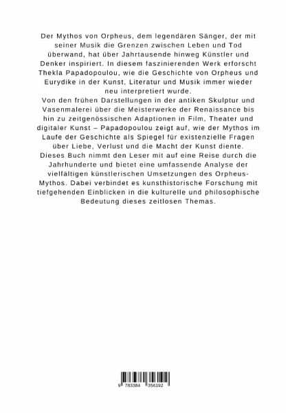 Der Mythos von Orpheus, dem legendären Sänger, der mit seiner Musik die Grenzen zwischen Leben und Tod überwand, hat über Jahrtausende hinweg Künstler und Denker inspiriert. In diesem faszinierenden Werk erforscht Thekla Papadopoulou, wie die Geschichte von Orpheus und Eurydike in der Kunst, Literatur und Musik immer wieder neu interpretiert wurde.Von den frühen Darstellungen in der antiken Skulptur und Vasenmalerei über die Meisterwerke der Renaissance bis hin zu zeitgenössischen Adaptionen in Film, Theater und digitaler Kunst - Papadopoulou zeigt auf, wie der Mythos im Laufe der Geschichte als Spiegel für existenzielle Fragen über Liebe, Verlust und die Macht der Kunst diente.Dieses Buch nimmt den Leser mit auf eine Reise durch die Jahrhunderte und bietet eine umfassende Analyse der vielfältigen künstlerischen Umsetzungen des Orpheus-Mythos. Dabei verbindet es kunsthistorische Forschung mit tiefgehenden Einblicken in die kulturelle und philosophische Bedeutung dieses zeitlosen Themas.