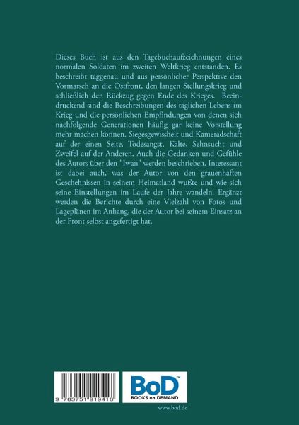 Zweiter Weltkrieg: Ostfront, Vormarsch, Stellungskrieg, Rückzug und schließlich der Zusammenbruch. Der Autor berichtet von seinem Erleben und seinen Erfahrungen im Krieg, erst als einfacher Soldat an der Ostfront, später als Kompanieführer im Mittelabschnitt. Beeindruckend sind die vielen persönlichen Eindrücke und die Beschreibung des täglichen Lebens im Krieg, von dem sich gerade jüngere Menschen häufig gar keine Vorstellung mehr machen können. Wie zunächst Siegesgewissheit und Kameradschaft, später auch Kälte, Angst und Zweifel, aber auch Gedanken an die Russen gegenüber auf einen Soldaten wirken können, wird hier eindrucksvoll beschrieben. Besonders interessant ist in diesem Zusammenhang zu lesen, wie sich die Einstellungen des Autors im Laufe der Jahre wandeln. Ergänzt werden die Berichte durch eine Vielzahl von Fotos im Anhang, die der Autor bei seinem Einsatz an der Front selbst angefertigt hat.