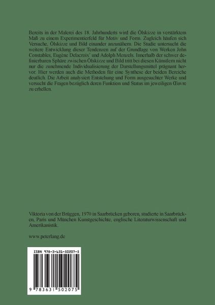 Bereits in der Malerei des 18. Jahrhunderts wird die Ölskizze in verstärktem Maß zu einem Experimentierfeld für Motiv und Form. Zugleich häufen sich Versuche, Ölskizze und Bild einander anzunähern. Die Studie untersucht die weitere Entwicklung dieser Tendenzen auf der Grundlage von Werken John Constables, Eugène Delacroix' und Adolph Menzels. Innerhalb der schwer definierbaren Sphäre zwischen Ölskizze und Bild tritt bei diesen Künstlern nicht nur die zunehmende Individualisierung der Darstellungsmittel prägnant hervor. Hier werden auch die Methoden für eine Synthese der beiden Bereiche deutlich. Die Arbeit analysiert Entstehung und Form ausgesuchter Werke und versucht die Fragen bezüglich deren Funktion und Status im jeweiligen uvre zu erhellen.