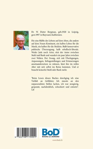 Dr. W. Dieter Bergman, geb.1920 in Leipzig, gest.1997 in Hayward, Kalifornien.Die eine Hälfte des Lebens auf dem Alten, die andere auf dem Neuen Kontinent, ein halbes Leben für die Musik, ein halbes für die Medizin. Halb konservative politische Überzeugung, halb rebellisch-liberale.Weder Jude noch Arier, sitzt der Autor zwischen Stuhl und Bank und wandert ein paar Jahre zwischen zwei Welten. Der Zwang, sich mit Überlegungen, Anpassungen, Infragestellungen und Erinnerungen auseinandersetzen zu müssen, lässt ihn im reifen Alter mit sich selbst ins Reine kommen. Und er braucht keinerlei Stuhl oder Bank mehr.