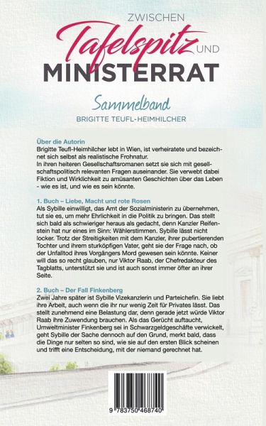 Inhalt von Buch 1: Als Sybille das Amt der Sozialministerin antritt, möchte sie vor allem eines: mehr…mehr„Tafelspitz und Ministerrat“ ist wieder ein äußerst vergnüglicher heiterer Gesellschaftsroman aus der Feder, der österreichischen Autorin Brigitte Teufl-Heimhichler. Dieser Sammelband beinhaltet zwei wunderbare Geschichten, und zwar „Liebe, Macht und rote Rosen“ und „Der Fall Finkenberg“.