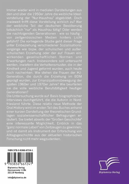 Immer wieder wird in medialen Darstellungen aus den und über die 1950er Jahre die weibliche Idealvorstellung der "Nur-Hausfrau" abgebildet. Doch inwieweit trifft diese Vorstellung wirklich zu? War der weibliche Teil der deutschen Bevölkerung tatsächlich "nur" als Hausfrau tätig? Oder werden die nachfolgenden Generationen - wie so häufig - von zeitgenössischen Medien hinters Licht geführt? Die vorliegende Studie geht dieser Frage unter Einbeziehung verschiedener Sozialisationsvorgänge wie bspw. der schulischen und außerschulischen Erziehung oder der auf Frauen einwirkenden gesellschaftlichen Normen und Erwartungen nach. Insbesondere soll untersucht werden, inwiefern die Verhaltensmuster, die in der Kindheit und Jugend geformt wurden, auch heute noch nachwirken. Wie stehen die Frauen der HJ-Generation, die durch die Erziehung im BDM geprägt wurden, zur Emanzipationsbewegung der späten 1960er und 1970er Jahre? Wie beurteilen sie die volle weibliche Berufstätigkeit heutiger Generationen?Die Untersuchung wurde auf Basis biographischer Interviews durchgeführt, die die Autorin in Nordfriesland führte. Diese relativ neue Methode der Oral History wird im ersten Teil des Buches anhand einer kurzen Darstellung der theoretischen Grundlagen sozialwissenschaftlicher Befragungen erläutert. Sie bietet abseits der "Großen Geschichte" eine interessante Möglichkeit, Einblick in das "ganz normale Leben" von Zeitzeugen zu gewinnen, und ist damit als Instrument der Erforschung von Alltagsgeschichte aus der aktuellen historischen Forschung nicht mehr wegzudenken.