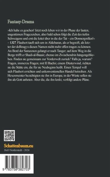 »Ich habe es gesehen! Jetzt noch leben wir in der Phase der lauten, ungestümen Fragezeichen, aber bald schon folgt die Zeit des tiefen Schweigens und erst die leitet über in die der Tat - ein Donnergrollen!« - 1327. Flaubert tauft sich um in Aldebaran, als er begreift, als letzter der deBougys diesen Namen nicht mehr offen tragen zu können. An Bord der Sarazenen gelangt er nach Tanger; auf dem Weg in die Berge trifft er Shadi-al-Baasir, ebenso im Zwischendrin hängengeblieben. Finden sie gemeinsam zur Vorderwelt zurück? Falls ja, warum? Fragen, immerzu Fragen; mit El Bachir, einem Düsterwind, richten sie die Stätte ein, die für sie Neubeginn heißt. Einen Tempel will sich Flaubert errichten und unkonventionellen Handel betreiben. Als Hexenmeister bezichtigten sie ihn in Europa; in der Wüste sollen sie ihn als Gott anbeten. Aber die, die ihn lenkt, verfolgt andere Pläne.