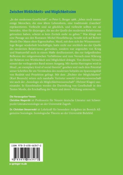 "In der modernen Gesellschaft", so Peter L. Berger 1988, "leben noch immer einige Menschen, die eine ältere Lebensform, eine traditionale 'Ganzheit' repräsentieren. Vielleicht sind sie glücklich, und vielleicht sollten wir sie beneiden. Aber für diejenigen, die aus der Quelle des modernen Relativismus getrunken haben, scheint es kein Zurück mehr zu geben." Was klingt wie eine Passage aus den Romanen Michel Houellebecqs, bezieht sich auf Robert Musils Roman Der Mann ohne Eigenschaften. Musil, mit dem sich der Wissenssoziologe Berger wiederholt beschäftigte, hatte nicht nur reichlich aus der Quelle des modernen Relativismus getrunken, sondern war angesichts von Krieg und Staatszerfall auch in einem Maße desillusioniert, das zur tiefgreifenden Reflexion der zeitgenössischen Verhältnisse und zum Versuch einer Klärung der Relation von Wirklichkeit und Möglichkeit drängte. Von diesem Versuch nimmt der vorliegenden Band seinen Ausgang. Mit Austin Harrington wird in Musil "an exemplary kind of social theorist" gesehen und nach dem Potential seiner Schriften für ein Verständnis des modernen Subjekts im Spannungsfeld von Realität und Projektion gefragt. Mit dem "Dichter der Möglichkeiten" (Kurt Benesch) setzen sich namhafte Vertreter sowohl Literaturwissenschaft wie auch der "Soziologie als Möglichkeitswissenschaft" (Helmut Klages) auseinander. In Einzelstudien werden die Darstellung von Gesellschaft in den Texten Musils, die Erschaffung der Texte und deren Wirkung untersucht.