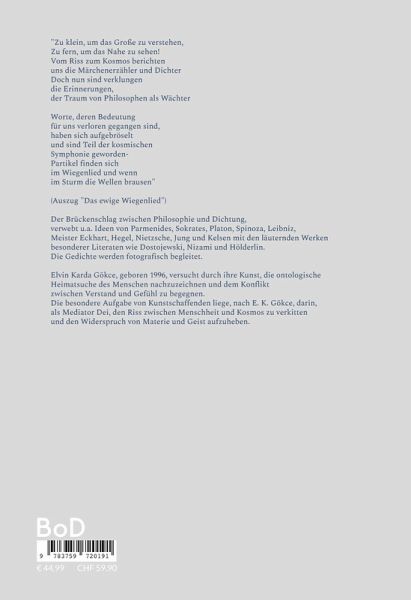 Der Brückenschlag zwischen Philosophie und Dichtung verwebt u. a. Ideen von Parmenides, Sokrates, Platon, Spinoza, Leibniz, Meister Eckhart, Hegel, Nietzsche und Kelsen mit den läuternden Werken besonderer Literaten, wie Dostojewski, Nizami und Hölderlin. Die Gedichte werden fotografisch begleitet."Zu klein, um das Große zu verstehen, Zu fern, um das Nahe zu sehen! Vom Riss zum Kosmos berichten uns die Märchenerzähler und Dichter Doch nun sind verklungen die Erinnerungen, der Traum von Philosophen als Wächter Worte, deren Bedeutung für uns verloren gegangen sind, haben sich aufgebröselt und sind Teil der kosmischen Symphonie geworden- Partikel finden sich im Wiegenlied und wenn im Sturm die Wellen brausen" (Auszug "Das ewige Wiegenlied")