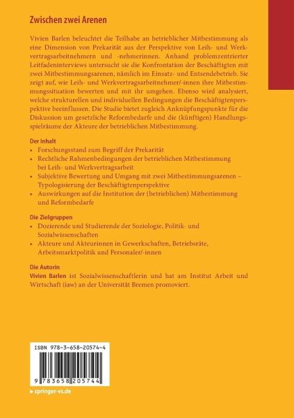 Vivien Barlen beleuchtet die Teilhabe an betrieblicher Mitbestimmung als eine Dimension von Prekarität aus der Perspektive von Leih- und Werkvertragsarbeitnehmern und -nehmerinnen. Anhand problemzentrierter Leitfadeninterviews untersucht sie die Konfrontation der Beschäftigten mit zwei Mitbestimmungsarenen, nämlich im Einsatz- und Entsendebetrieb. Sie zeigt auf, wie Leih- und Werkvertragsarbeitnehmer/-innen ihre Mitbestimmungssituation bewerten und mit ihr umgehen. Ebenso wird analysiert, welche strukturellen und individuellen Bedingungen die Beschäftigtenperspektive beeinflussen. Die Studie bietet zugleich Anknüpfungspunkte für die Diskussion um gesetzliche Reformbedarfe und die (künftigen) Handlungsspielräume der Akteure der betrieblichen Mitbestimmung.