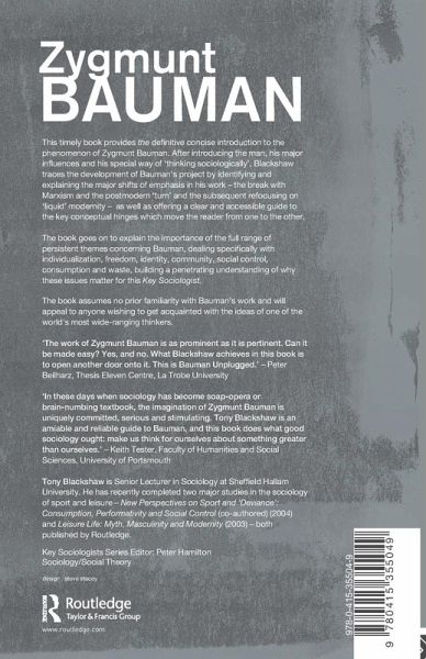 This timely book provides the definitive concise introduction to the phenomenon of Zygmunt Bauman. After introducing the man, his major influences and his special way of 'thinking sociologically', author Blackshaw traces the development of Bauman's project by identifying and explaining the major shifts of emphasis in his work - the break with Marxism and the postmodern 'turn', and the subsequent refocusing on 'liquid' modernity - as well as offering a clear and accessible guide to the key conceptual hinges which move the reader on.