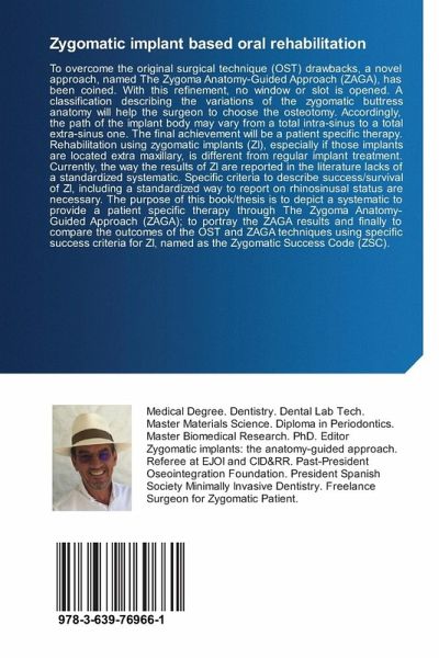 To overcome the original surgical technique (OST) drawbacks, a novel approach, named The Zygoma Anatomy-Guided Approach (ZAGA), has been coined. With this refinement, no window or slot is opened. A classification describing the variations of the zygomatic buttress anatomy will help the surgeon to choose the osteotomy. Accordingly, the path of the implant body may vary from a total intra-sinus to a total extra-sinus one. The final achievement will be a patient specific therapy. Rehabilitation using zygomatic implants (ZI), especially if those implants are located extra maxillary, is different from regular implant treatment. Currently, the way the results of ZI are reported in the literature lacks of a standardized systematic. Specific criteria to describe success/survival of ZI, including a standardized way to report on rhinosinusal status are necessary. The purpose of this book/thesis is to depict a systematic to provide a patient specific therapy through The Zygoma Anatomy-Guided Approach (ZAGA); to portray the ZAGA results and finally to compare the outcomes of the OST and ZAGA techniques using specific success criteria for ZI, named as the Zygomatic Success Code (ZSC).