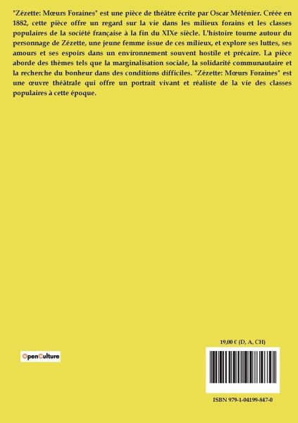 "Zézette: moeurs foraines" d'Oscar Méténier nous plonge dans l'univers des forains à travers l'histoire de François Chausserouge, un dompteur de fauves. L'intrigue débute avec Chausserouge, un homme d'origine bohème, qui, après avoir surmonté de nombreux obstacles, parvient à se faire une place parmi les forains. Sa vie prend une nouvelle tournure lorsqu'il épouse Maria, une jeune femme issue d'une famille de ramonis. Ensemble, ils bâtissent une vie prospère, mais le bonheur est de courte durée. La naissance de leur fils François, tant désirée, coïncide avec la mort tragique de Maria, laissant Chausserouge dévasté. Malgré cette perte, il reporte son amour sur son fils, espérant lui offrir un avenir meilleur. Cependant, François, élevé dans l'univers des foires, aspire à suivre les traces de son père. Malgré les efforts de Chausserouge pour lui offrir une éducation classique, François est irrémédiablement attiré par le monde des fauves. Il finit par rejoindre son père dans la ménagerie, où il démontre un talent inné pour le domptage. Le récit explore les thèmes de la destinée, de la passion et des sacrifices, tout en peignant un tableau vivant et parfois sombre de la vie foraine. Méténier, à travers une écriture immersive, nous fait ressentir les tensions et les drames qui jalonnent la vie de ces personnages attachants et complexes.