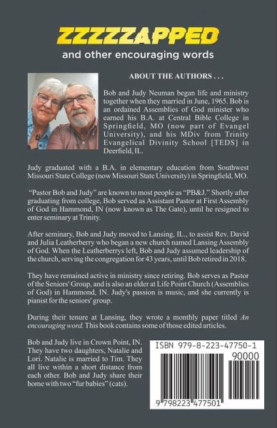 ZZZZZAPPED and other encouraging words are a series of articles that Bob and Judy Neuman originally published under the title "An encouraging word." These articles were written over a period of 43 years while Bob Neuman served as Pastor of Lansing Assembly of God in Lansing, IL. The articles have been updated and re-edited. They are humorous, faith-based, and family-oriented articles of a non-fiction religious nature.