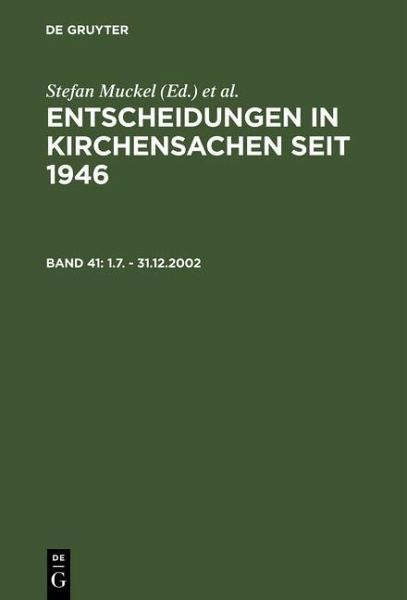 Die vom Institut für Kirchenrecht und rheinische Kirchenrechtsgeschichte an der Rechtswissenschaftlichen Fakultät der Universität zu Köln betreute Sammlung "Entscheidungen in Kirchensachen seit 1946" bietet die Judikatur staatlicher Gerichte zum allgemeinen Religionsrecht und zum Verhältnis von Kirche und Staat. Die Sammlung ist die einzige ihrer Art im deutschsprachigen Raum. Bislang sind 40 Bände mit über 2800 Entscheidungen aus allen Gerichtszweigen erschienen. Sie bilden zugleich ein Dokument der Zeitgeschichte. Ab Band 39 wird die für die Verhältnisse in Deutschland relevante Rechtsprechung europäischer Gerichtshöfe in die Sammlung einbezogen. Der vorliegende Band 41 umfasst die Entscheidungen in Kirchensachen für den Zeitraum 1.7.2002 bis 31.12.2002.
