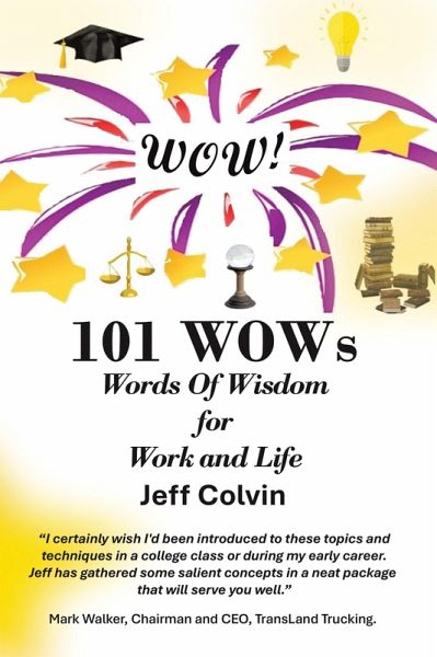101 WOWs - Words Of Wisdom for Work and Life is certainly going to help you to become a more wise person. You will reinforce and clarify the current approaches you use today to manage routine challenges. You will pick up new methods to prevent or address other hurdles you encounter. The process to build your wisdom will be not come from the knowledge or learning alone, but with the application to your daily life. With each event, the truly wise person will continue to extract fundamentals of their own, and others, past successes and failures. The real gift of wisdom is to pass it on to others as I have intended to do here. This book provides the opportunity for me to leave a legacy providing all readers a chance to gain a faster path to achievement for their personal growth and success. Share your wisdom, share this book. The title of this book, "101 WOWs (Words of Wisdom for Work and Life) is really a conundrum. There really is no separation; work is life and life is work. These WOWs will help you enjoy both more. Share wisdom. Get wiser. Be wise. "A thoughtful and practical compendium of timeless wisdom - '101 WOWs' distills years of experience into bite-sized prompts that inspire re ection, sharpen decisions, and o er steady guidance through the twists of work and life." Chris Plasser, EY - Vice President & Global Head, New Ventures "I love this book. Je has once again delivered an engaging read by focusing on key concepts while keeping the tone fun and approachable. I especially appreciate how the book highlights important ideas and presents them in clear, simple bullet points that are easy to navigate and revisit. I would highly recommend it to anyone looking for fresh creative approaches or simply wanting a valuable refresher." Anonymous, Operations Manager - High Tech Company Silicon Valley "In this tidy, content-rich guidebook, Je Colvin packs a thought-and-action-provoking collection of tips, tricks, way- ndings, and witticisms. Start with a quick cover-to-cover reading (it's a page turner), put it on your shelf for ready access, and return to topics of interest with more intention and study time. You'll be rewarded, again and again, with sound advice and new ways of perceiving events and situations. Start today!" Alfredo Zangara, Organizational Betterment Field Guide
