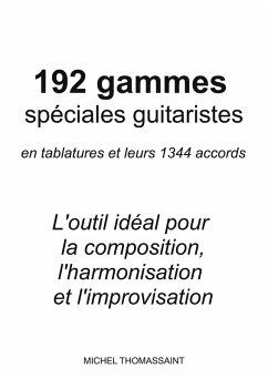 Les 192 gammes spéciales guitaristes et leurs 1344 accords en tablatures et diagrammes d'accords Cet ouvrage a été conçu afin de rendre le meilleur service possible aux guitaristes souhaitant créer leurs musiques aisément. C'est pourquoi les portées de solfège n'apparaissent pas : j'ai choisi de privilégier l'outil ''tablature'' d'une utilisation facile et courante, en indiquant quand même le nom des notes au-dessus. La notation internationale s'est imposée, d'abord par souci de lisibilité et, ensuite, parce que connue de la grande majorité des guitaristes actuels. Chacune de ces gammes (majeures, mineures et pentatoniques) a été travaillée de façon à vous proposer une position la plus intéressante possible tout en étant jouable aussi bien en acoustique qu'en électrique, c'est-à-dire en ne dépassant pas trop la 12ème case : tout le monde n'a pas un pan coupé sur sa guitare ! De même, j'ai choisi des formes d'accords assez simples et connues, privilégiant la facilité. Là aussi, amusez-vous à choisir d'autres formes et positions d'accords selon vos préférences. Ainsi, vous trouverez dans cet ouvrage : > 192 gammes classées par tonalités, de A à G#, avec 16 gammes différentes dans chaque tonalité. > 192 gammes pentatoniques associées aux gammes d'origine (mineure ou majeure) en choisissant les positions les plus intéressantes. > 1344 diagrammes d'accords avec l'indication des doigts. Enfin à votre portée immédiatement : 84 Modes Grecs = les 7 degrés des 12 gammes majeures 84 Modes Grecs altérés = les 7 degrés des 12 gammes mineures harmoniques 24 Modes de Bartók = les 12 Modes majeurs & les 12 Modes mineurs mélodiques ascendants En bonus : les Modes joués par vos guitaristes favoris. Cet ouvrage pourrait bien changer votre vie de guitariste!