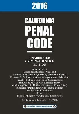 The full text of the California Penal Code and the full text of the Evidence Code and Criminal Justice related sections from the following California Codes: Business & Professions; Family; Fish & Game; Harbors & Navigation; Health & Safety; Insurance; Public Resources and Welfare & Institutions, as well as the Peace Officers' Bill of Rights and the Miranda Advisement.