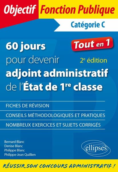 Vous voulez devenir adjoint administratif de 1re classe dans la fonction publique de l'État ? Cette réussite ne saurait s'improviser et vous devez préparer méthodiquement chacune des trois épreuves : explication de texte ; courts exercices de français et de mathématiques ; épreuve pratique. Or de nombreux candidats éprouvent de la difficulté à organiser dans le temps cette préparation au concours. C'est pourquoi les auteurs vous proposent une organisation de la préparation en 60 jours. Chaque jour de travail, vous aurez à étudier une fiche de révision et/ou à faire des exercices avant d'en étudier le corrigé. Vous trouverez également des conseils méthodologiques et pratiques pour les épreuves. Enfin, vous vous évaluerez régulièrement avec des sujets de concours récents.