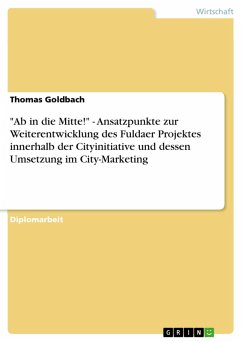 Diplomarbeit aus dem Jahr 2004 im Fachbereich BWL - Offline-Marketing und Online-Marketing, Note: 1,8, Hochschule Fulda (Stadtverwaltung Fulda), Veranstaltung: "Ab in die Mitte!", Sprache: Deutsch, Abstract: In der vorliegenden Arbeit wurde eine Untersuchung eines City-Marketing-Projektes, eine qualitative Bewertung der Innenstadt als auch eine Analyse der Organisationsstrukturen des City- und Stadtmarketings der Stadt Fulda durchgeführt. Durch eine Passantenbefragung, Interviews mit Experten und einen Rückgriff auf vorhandenes Datenmaterial konnten Ergebnisse gewonnen werden, um Stärken und Schwächen heraus-zuarbeiten und daraus Handlungsimplementierungen abzuleiten. Die Untersuchung zeigte, dass das City-Marketing-Projekt gute bis sehr gute Resultate erzielt hat und von den Bürgen überwiegend positiv aufgenommen wurde. Die durchgeführten Veranstaltungen waren gut ausgewählt und bestehende Defizite können durch eine sorgsame Planung ausgeglichen werden. Durch eine Fortsetzung des Projektes kann die Stadt Fulda einen positiven Beitrag zur Stärkung des Standortes leisten. Auch die Initiatoren des Projektes in Fulda stehen einer Fortführung einstimmig gegenüber. Darüber hinaus animierten die Veranstaltungen die Besucher zu weiteren Aktivitäten in der Innenstadt. Fulda hat sich als eine Stadt mit einem qualitativ hohem Niveau an Einzelhandel, Gastronomie-, Freizeit- und Kulturangebot herausgestellt. Schwächen in einzelnen Bereichen wie z. B. Parkraum und Verkehr können ausgeglichen werden. Die Organisationsstrukturen im City- und Stadtmarketing von Fulda haben sich als verbesserungswürdig herausgestellt. Zu viele Akteure arbeiten unabhängig voneinander. Durch eine bessere Koordination könnte ein wirksameres Vorgehen für gemeinsame Marketing-Aktivitäten erzielt werden. Im Mittelpunkt der Arbeit standen Anregungen für die Schaffung einer lebendigen Innenstadt, wobei durch Verbesserungen und Optimierungs-vorschläge ein hoher Grad an Multifunktionalität in den verschiedensten Bereichen der Innenstadt erreicht werden sollte.