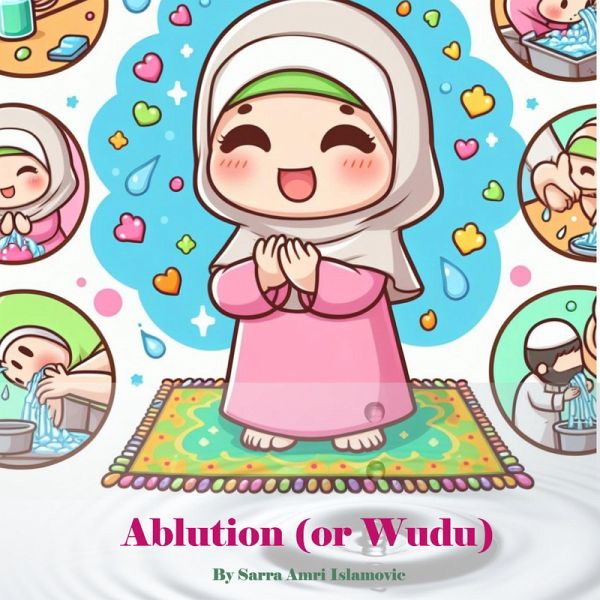 The steps of Wudu in Islam with pictures cartoon that shows the steps