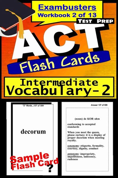 "e;ACT Prep Flashcard Workbook 2: VOCABULARY-Intermediate"e;500 frequently tested ACT words every high school student should know. Perfect for anyone who wants to enrich their vocabulary! Improve your reading comprehension and conversation. Includes sample sentence, part of speech, pronunciation, succinct, easy-to-remember definition, and common synonyms and antonyms. [==================]ADDITIONAL WORKBOOKS:"e;ACT Prep Flashcard Workbook 7: ALGEBRA"e;450 questions and answers that highlight introductory algebra definitions, problems, and concepts. Topics: Algebraic Concepts, Sets, Variables, Exponents, Properties of Numbers, Simple Equations, Signed Numbers, Monomials, Polynomials, Additive and Multiplicative Inverse, Word Problems, Prime Numbers, Factoring, Algebraic Fractions, Ratio and Proportion, Variation, Radicals, Quadratic Equations_______________"e;ACT Prep Flashcard Workbook 9: ALGEBRA 2-TRIGONOMETRY"e;500 questions and answers that focus on essential advanced algebra and trigonometry concepts. (ILLUSTRATED) Topics: Linear Equations, Quadratics, Conic Sections, Logarithms, Trig. Functions, Sequence and Series=============================="e;EXAMBUSTERS ACT Prep Workbooks"e; provide comprehensive, fundamental ACT review--one fact at a time--to prepare students to take practice ACT tests. Each ACT study guide focuses on one specific subject area covered on the ACT exam. From 300 to 600 questions and answers, each volume in the ACT series is a quick and easy, focused read. Reviewing ACT flash cards is the first step toward more confident ACT preparation and ultimately, higher ACT exam scores!