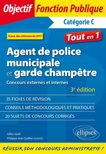 Vous voulez réussir le concours externe d'agent (gardien brigadier) de police municipale ou de garde champêtre (chef) ? Ou un des deux concours internes d'agent (gardien brigadier) de police municipale mis en place par le décret du 28 avril 2017, si vous êtes déjà agent de surveillance de la voie publique, adjoint de sécurité de la police nationale ou volontaire de la gendarmerie nationale ? Votre réussite ne saurait s'improviser et vous devez préparer chaque épreuve. Pour vous mettre sur la voie du succès, deux formateurs du CNFPT (Centre national de la fonction publique territoriale), l'un chef de police municipale, l'autre spécialiste en méthodologie, en français et en droit, vous proposent : . une méthodologie détaillée pour chaque épreuve écrite et orale ; . des conseils de préparation précis et adaptés (y compris pour la rédaction du dossier dans les concours internes) ; . de nombreux sujets de concours corrigés ; . toutes les connaissances nécessaires à la réussite des épreuves ; . toutes les informations utiles à votre inscription.
