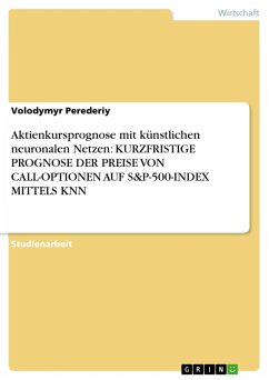 Studienarbeit aus dem Jahr 2002 im Fachbereich BWL - Investition und Finanzierung, Note: 1,7, Europa-Universität Viadrina Frankfurt (Oder), Veranstaltung: Künstliche Neuronale Netze in der Finanzwirtschaft, Sprache: Deutsch, Abstract: EINFÜHRUNG Die neuronale Netze haben in den 80er-90er Jahren eine enorme Popularität und Bedeutung für Finanzprognosen erlangt. Sie bieten bei weitem mehr Flexibilität als die traditionellen,, noch in den 60-er und 70-er Jahren gegründeten statistisch-ökonometrischen Methoden. Dennoch muss man heutzutage feststellen, dass die erfolgreiche Prognose für die jüngste Aktien-Zeitreihen in den letzten Jahren immer schwieriger geworden ist (vgl. White, s. 457-58) und meistens nur kommerziell unter Beanspruchung größerer EDV- und Investitionskapazitäten möglich wird, was nicht immer rentabel ist. Dies gilt insbesondere für etablierte Finanzmärkte der Industrieländer, und ist vor allem auf wachsende Markteffizienz und steigende Beanspruchung der KNN-Prognose an sich zurückzuführen. Die Optionen bieten in dieser Hinsicht ein viel versprechendes und noch wenig erschlossenes Einsatzfeld. Sie weisen starke Abhängigkeit nicht nur von Kursen des Basiswertes direkt, sondern auch von Volatilität, die auch unter Verwendung der klassischen statistischen Methoden ziemlich gut vorhersagbar ist (z.B. mit GARCH-Modellen, vgl. Mills, s. 133-137). Weiterhin, sind alle existierenden Optionspreismodelle höchstens nichtlinear, was den KNN einen Vorteil im Vergleich zu den meistens linear ausgeprägten statistischen Methoden verspricht. Dieses Teil der Arbeit beschäftigt sich mit 1-Tages-Prognose der S&P-500-Call- Optionsscheine, die an der Chicago Mercantile Exchange gehandelt werden. Das erste Kapitel beschäftigt sich ausschließlich mit Auswahl und technischer Vorverarbeitung (Preprossesing) des Datensatzes. Wie wir später sehen werden, ist diese Etappe sehr wichtig wegen der schwächeren Transparenz der Optionsscheine verglichen mit beispielsweise Aktien. Die weiteren zwei Kapitel beschreiben den Aufbau des KNN sowie das Trainieren des Netzes in NeuroSolutions-Umgebung. Im vierten Kapitel wird die Prognosekapazität des Netzes aus der Sicht eines risikofreudigen Investors beurteilt und mit einigen "naiven" Strategien verglichen.
