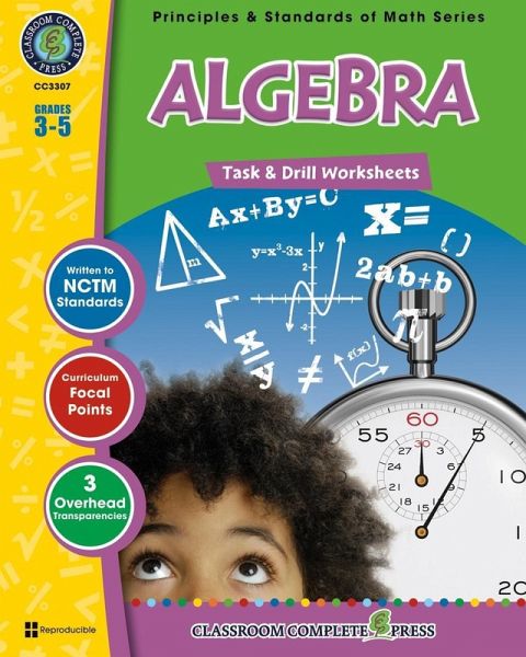 For grades 3-5, our State Standards-based combined resource meets the algebraic concepts addressed by the NCTM standards and encourages the students to review the concepts in unique ways. The task sheets introduce the mathematical concepts to the students around a central problem taken from real-life experiences, while the drill sheets provide warm-up and timed practice questions for the students to strengthen their procedural proficiency skills. Included are opportunities for problem-solving, patterning, algebraic graphing, equations and determining averages. The combined task & drill sheets offer space for reflection, and opportunity for the appropriate use of technology. Also contained are assessment and standards rubrics, review sheets, test prep, color activity posters and bonus worksheets. All of our content is aligned to your State Standards and are written to Bloom's Taxonomy, STEM, and NCTM standards.