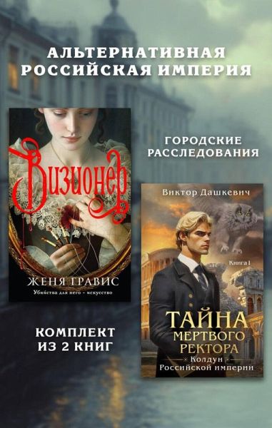 Dva zahvatyvayuschih detektivnyh romana v odnom komplekte! Tayna mertvogo rektora. Kniga 1 Posle grandioznoy i krovoprolitnoy bitvy graf Averin s Kuzey postupayut na sluzhbu v Upravlenie. Geroi zasluzhili otdyh, no dazhe v rodnom Peterburge nastali ne samye spokoynye vremena, a v dovershenie vsego v moskovskoy koldovskoy Akademii proishodit neschastnyy sluchay: pri strannyh obstoyatelstvah gibnet rektor, i na svobode okazyvaetsya silneyshiy div. No pochemu dlya rassledovaniya priglashayut imenno Germesa Averina? Kuzya i Vladimir tozhe berutsya za delo, no protiv glavnogo podozrevaemogo ulik net. I chto svyazyvaet ego i Vladimira? Vizioner Novogodnyaya noch 1920 goda, yanvarskaya Moskva, vesele, podarki - i mertvaya Snegurochka na ploschadi pod yolkoy. Idealno splanirovannoe ubiystvo: ni ulik, ni svideteley. Za svoyo pervoe delo beryotsya molodoy syschik i boykaya baryshnya iz dvoryanskoy semi. Mozhet, im stoit obedinit usiliya, ved kto znaet, kuda zavedyot ih poisk ubiytsy? Potomu chto na odnoy zhertve on yavno ne ostanovitsya.