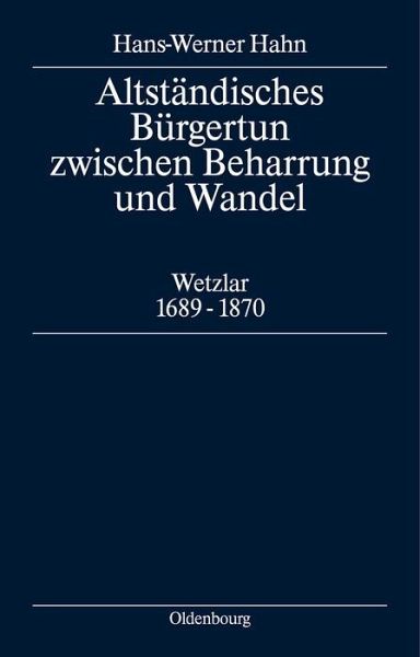 Frontmatter -- Inhalt -- Verzeichnis der Tabellen -- Vorwort -- Einleitung -- I. Die reichsstädtische Bürgergesellschaft Wetzlars vor dem Einzug des Reichskammergerichts im Jahre 1689 -- II. Politische Statussicherung - wirtschaftlicher Aufschwung - bedrohte Identität: Die Auswirkungen des Reichskammergerichts auf die Entwicklung der Stadtbürgergesellschaft -- III. Neue Herausforderungen und stadtbürgerliche Reaktionen: Ansätze und Grenzen reichsstädtischer Reformpolitik am Ende des 18. Jahrhunderts -- IV. Von der freien Reichsstadt zur Unterpräfektur Wetzlar: Das Wetzlarer Stadtbürgertum zwischen Mediatisierung und neuen Hoffnungen auf Eigenständigkeit 1803-1815 -- V. Städtische Selbstbehauptung und moderner Verwaltungsstaat: Wetzlar als Fremdkörper der preußischen Rheinprovinz 1815-1840/45 -- VI. Von der traditionalen Stadtbürgergesellschaft zur modernen "bürgerlichen Gesellschaft": Politische, soziale und kulturelle Wandlungsprozesse im Wetzlarer Bürgertum 1840 bis 1870 -- Zusammenfassung -- Anhang -- Abkürzungsverzeichnis -- Quellen- und Literaturverzeichnis -- Personenregister -- Orts- und Sachregister