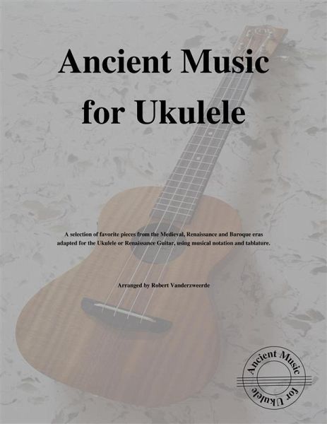 A selection of favorite pieces from the Medieval, Renaissance and Baroque eras adapted for the Ukulele or Renaissance Guitar, using musical notation and tablature. Ancient music written for the modern ukulele ….. None! Playing ancient music on the ukulele ….. Absolutely! This collection of favorite pieces from the Medieval, Renaissance and Baroque eras are adapted for the Ukulele or Renaissance Guitar, using musical notation and tablature. These pieces are the favorites of the arranger, Robert Vanderzweerde, for many reasons. Some are just fun to play, many will be recognized by music lovers of other genres so they become great "set" pieces when asked to demonstrate what you do and, finally, Robert performed many of these pieces while learning to play classical guitar and they have remained favorites ever since. The pieces in this book are ordered first by musical era and then by degree of difficulty, starting with those that are easier. When playing a soprano, concert or tenor ukulele, linear tuning is required (i.e. using a low G string). Notes about the composers and pieces are at the back of this book. Contents: Medieval Period (before 1400) & Traditional (all time periods) Coventry Carol (Anonymous) "Canção do figueiral" (Traditional Portuguese Ar Hyd y Nos (Traditional Welsh) Early One Morning (Traditional English) Renaissance Period (1400 to early 1600's) Bransle de Poitou (Adrian Le Roy) Bransle (Guillaume Morlaye) Tarleton's Resurrection (John Dowland) Greensleeves (Anonymous) Fantasie (Gregoire Brayssing) Buffons (Guillaume Morlaye) Tourdion (Adrian Le Roy) Pimontoyse (Adrian Le Roy) Conte Clare (Guillaume Morlaye) Villanesque (Guillaume Morlaye) Chanson "Nous voyons que les hommes" (Jacques Arcadelt) Almande "La mon amy la" (Adrian Le Roy) Mrs. Winter's Jump (John Dowland) Pavane IV (Luis de Milan) Deux Canons (Simon Gorlier) Baroque Period (early 1600's to 1750) Minuet (Christian Petzold) Bourrée (Johann Sebastian Bach) Sheep May Safely Graze (Johann Sebastian Bach) Rujero (Gaspar Sanz) Canarios (Gaspar Sanz) Recordings of the pieces are posted on either YouTube of SoundCloud (search for Ancient Music for Ukulele). Please check out the other books in this series "Ancient Music for Ukulele" by visiting our website (ancientmusic4ukulele.com) and/or Facebook page.