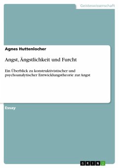 Essay aus dem Jahr 2003 im Fachbereich Psychologie - Sozialpsychologie, , Sprache: Deutsch, Abstract: Angst gehört fast wie eine Selbstverständlichkeit in unser alltägliches Leben. Obwohl über diese Emotion wenig kommuniziert wird, scheint es sich um ein Paradoxon zu handeln, dass Angst im Menschen fast allgegenwärtig zu sein scheint. Im Folgenden möchte ich näher auf den Angstbegriff eingehen und im Zuge dessen eine Auswahl der wichtigsten theoretischen Konzepte vorstellen. Schwerpunkt dieser Arbeit wird die normale Angstentwicklung im Kindes- und Jugendalter sein. Ein Überblick über die Kriterien zur Diagnose einer Angststörung schließt die Arbeit ab.